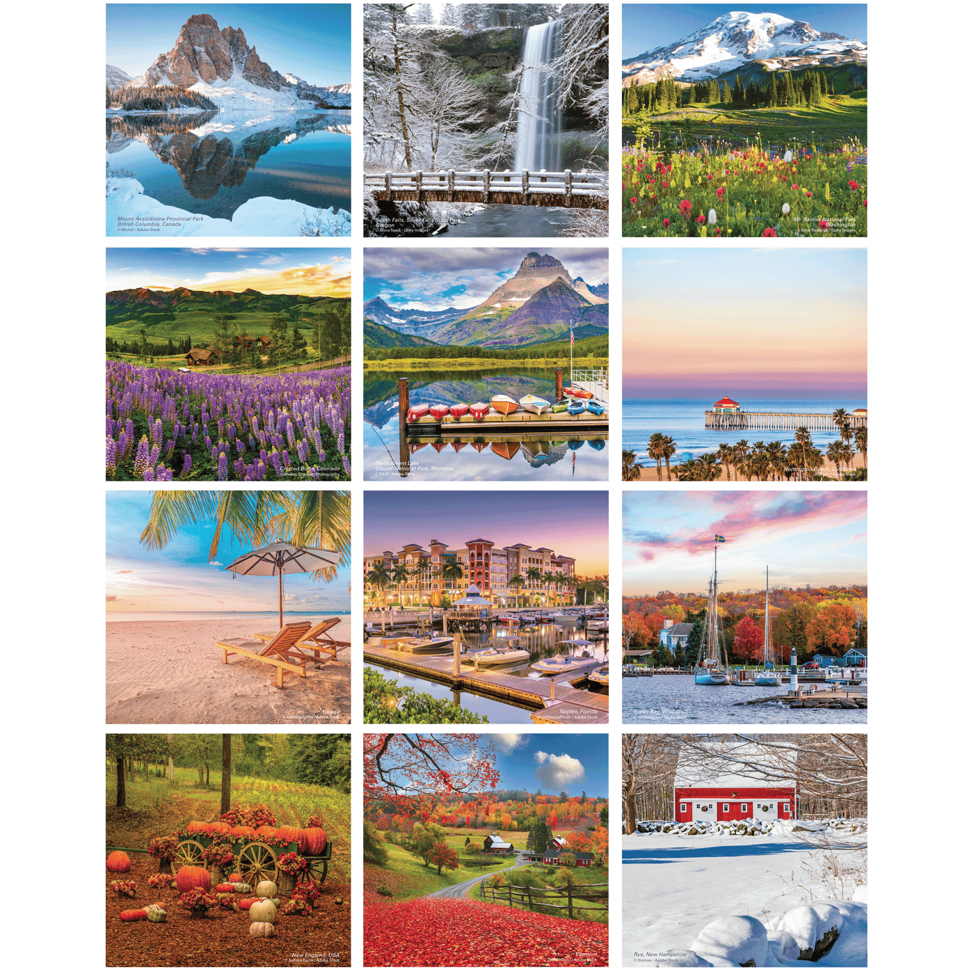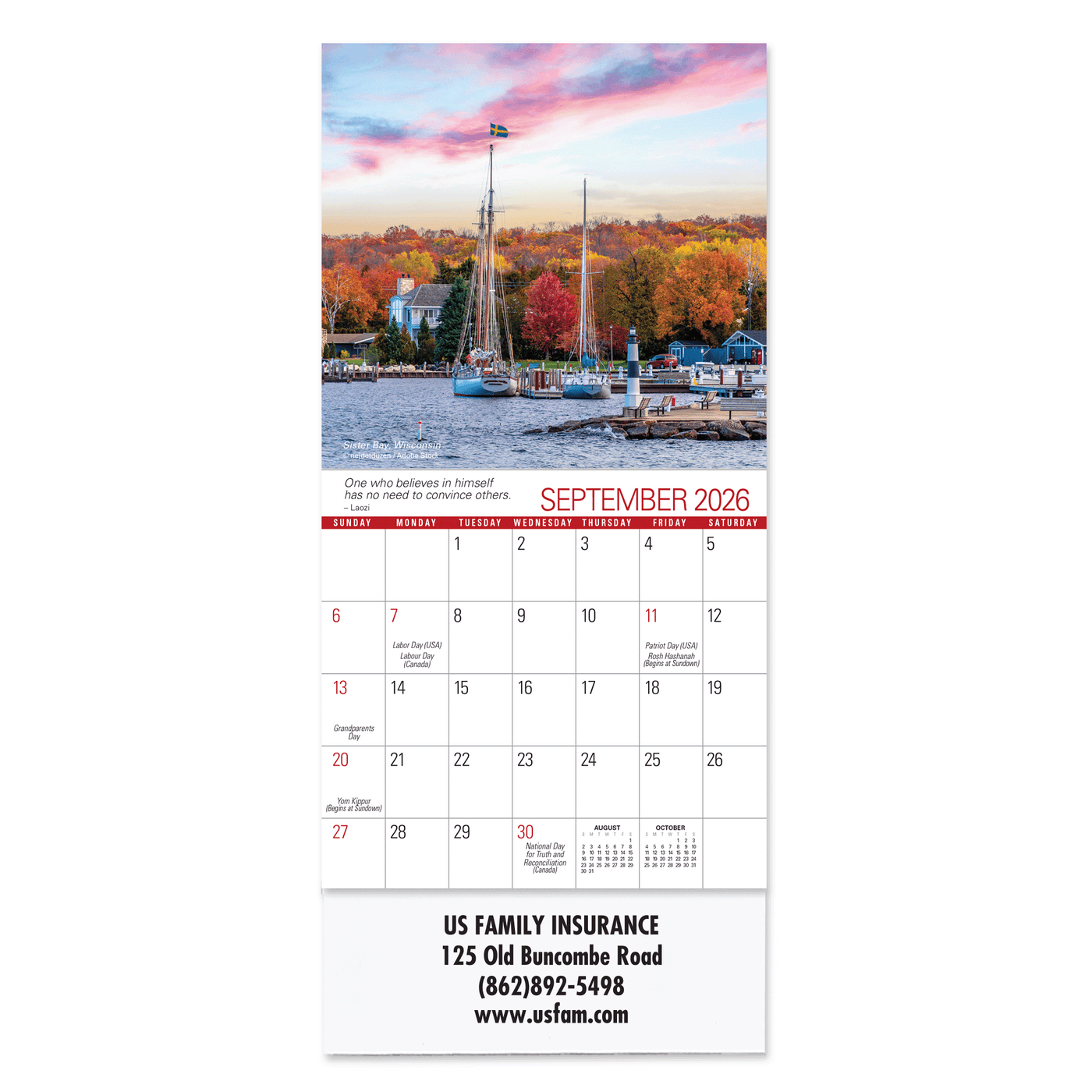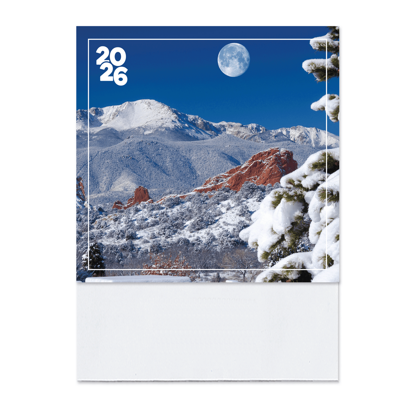 This full-color, high-gloss mini wall calendar for 2026 showcases 12 months of scenic beauty. Featured photographs include some of the most beautiful scenic locations in the United States and Canada. An inspirational quote is printed on each calendar page. Customize and keep your brand top of mind 365 days a year.