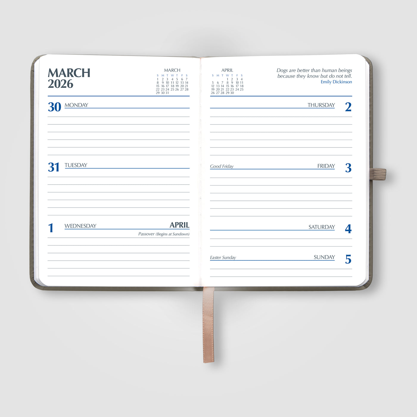 Rose Gold accents include the year 2026 on the cover and a Rose Gold ribbon bookmark. Your logo will stand out, silkscreened in white on the cover.