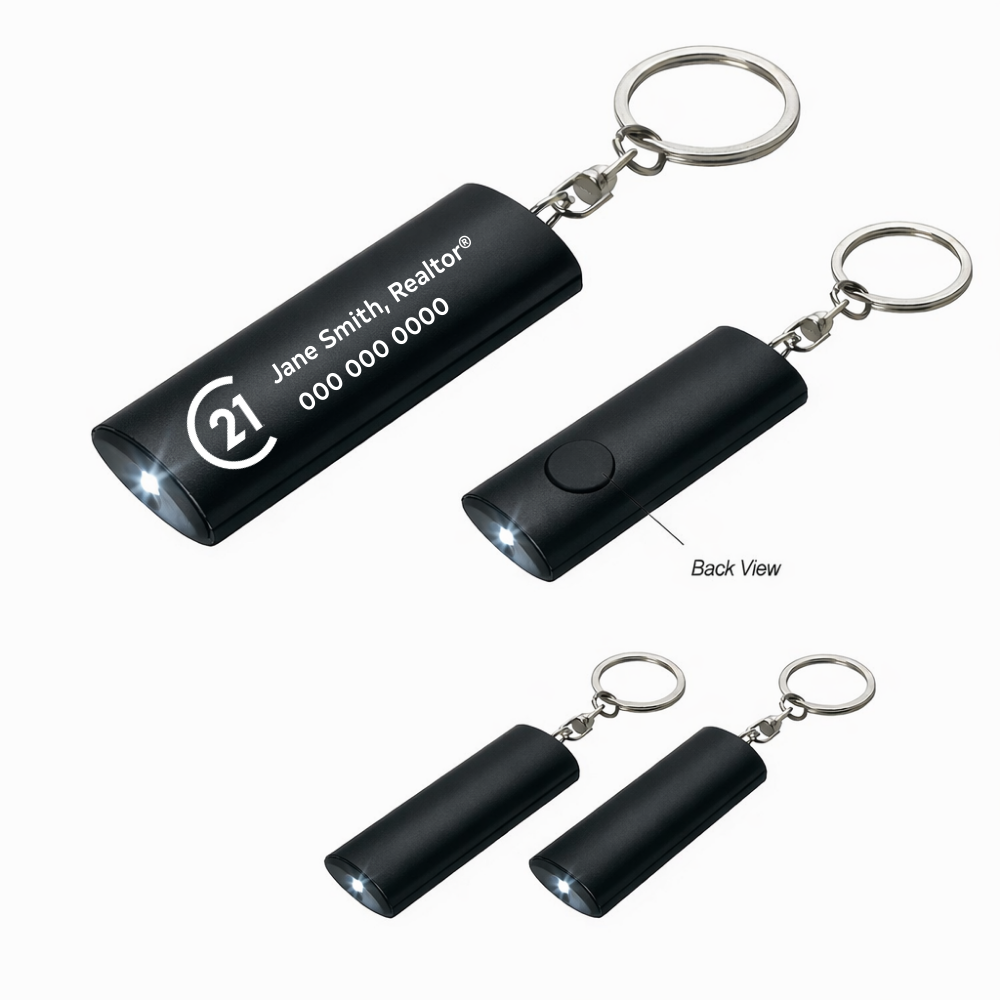 Sleek, compact, and practical, this black aluminium flashlight keychain is an everyday essential that keeps your brand visible. Featuring an extra-bright white LED light and durable metal construction, it’s ideal for keys, bags, or car use.