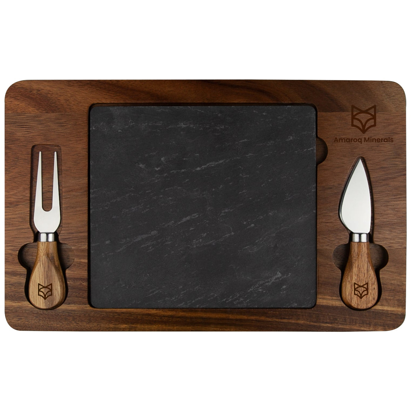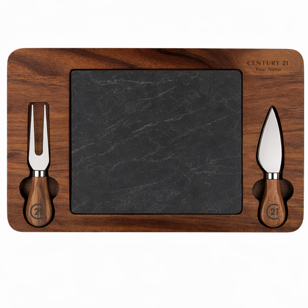 Your Logo Laser Engraved on the Slate Board: 50mmW x 35mmH AND the C21 Logo Engraved on the fork and knife.