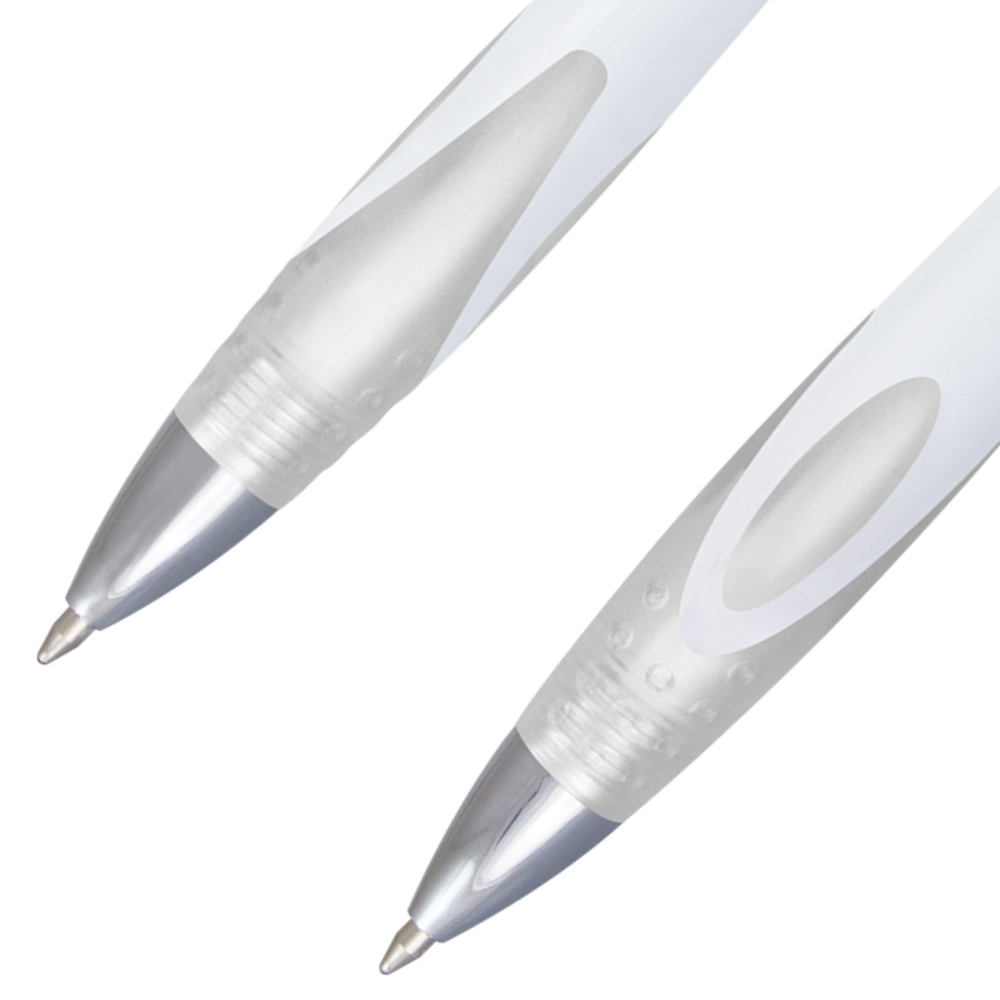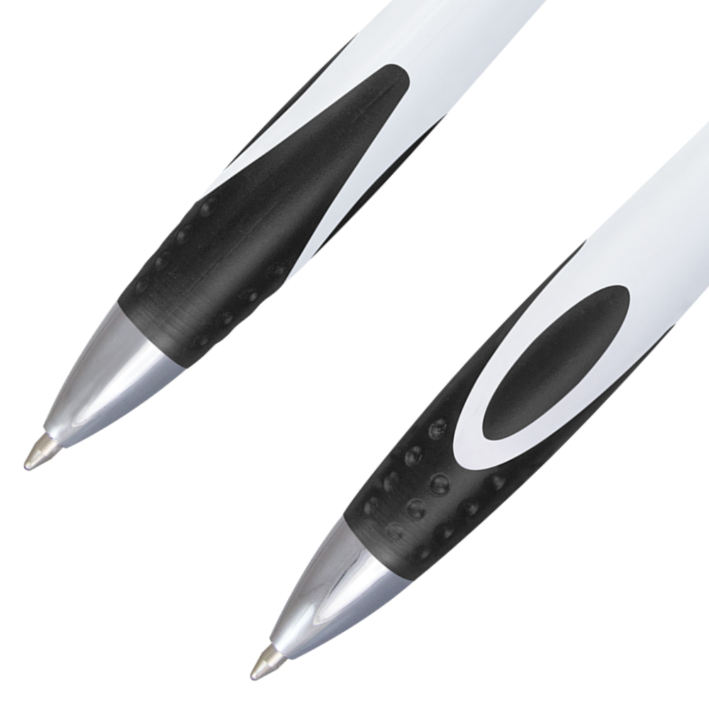 Retractable plastic pen with opaque white barrel and beautiful design of frosted translucent black or white soft-touch grip, shiny silver chrome trim.