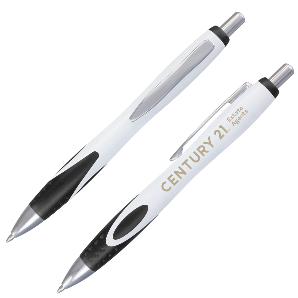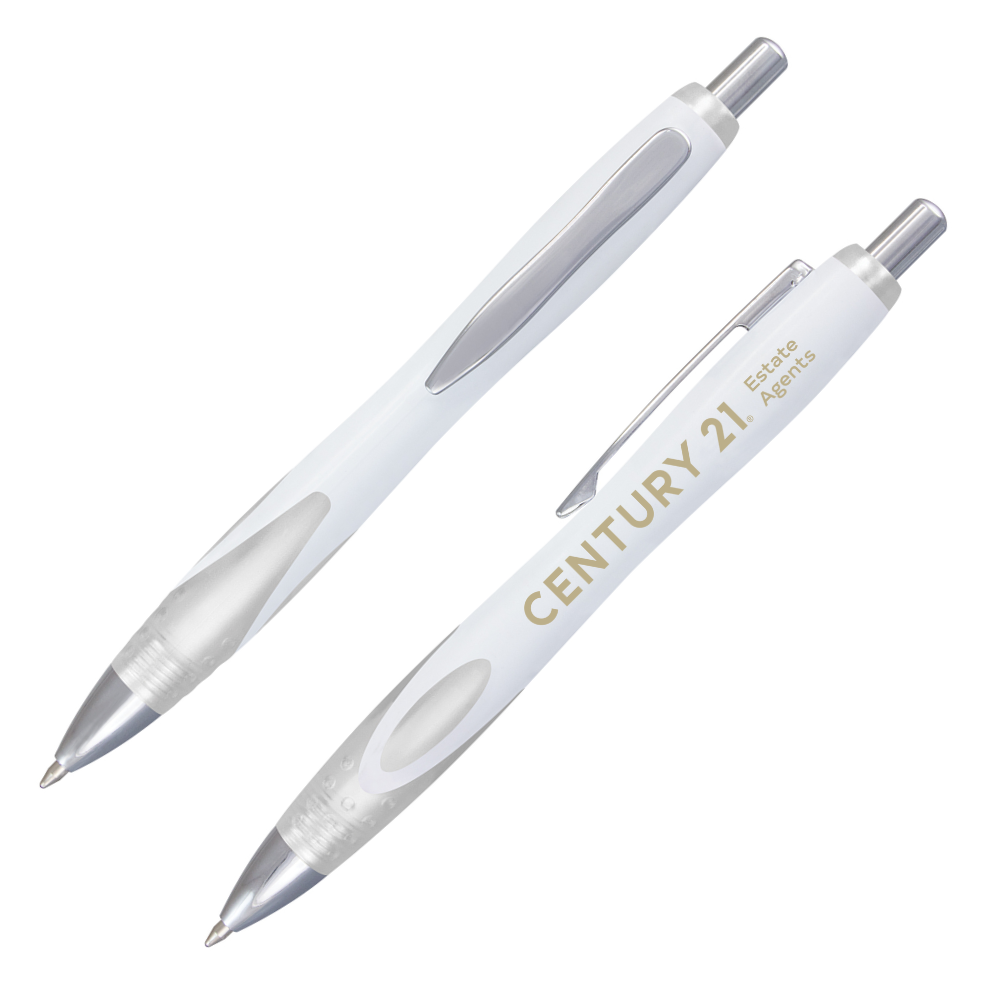 Retractable plastic pen with opaque white barrel and beautiful design of frosted translucent black or white soft-touch grip, shiny silver chrome trim.